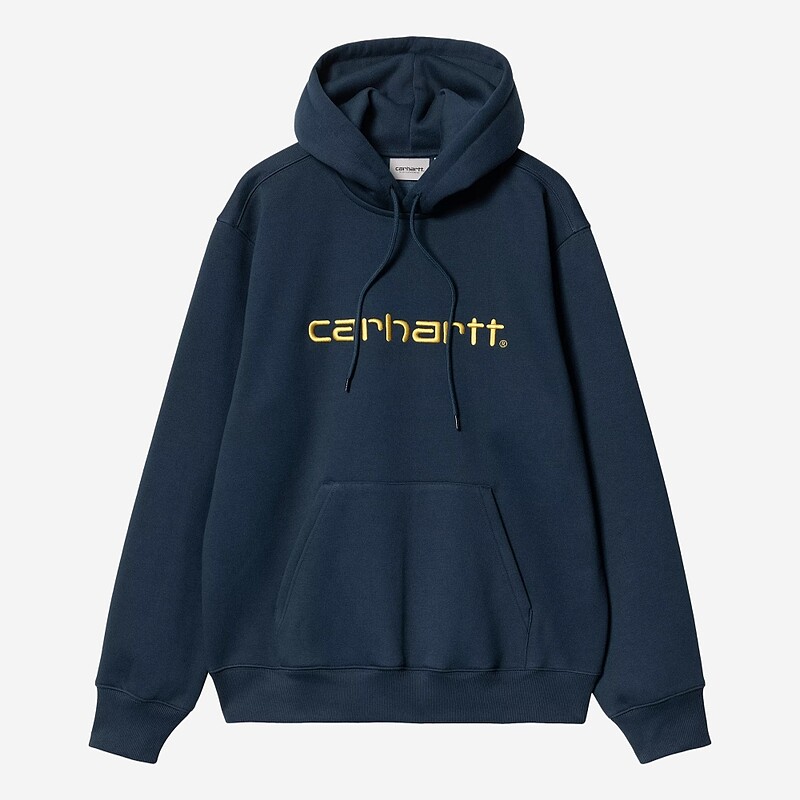 A sweat com capuz Hooded Carhartt WIP é fabricada em mistura robusta de algodão e poliéster de 369 g com tratamento escovado, que confere suavidade ao avesso do tecido.
